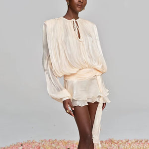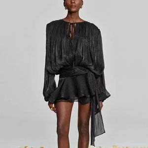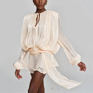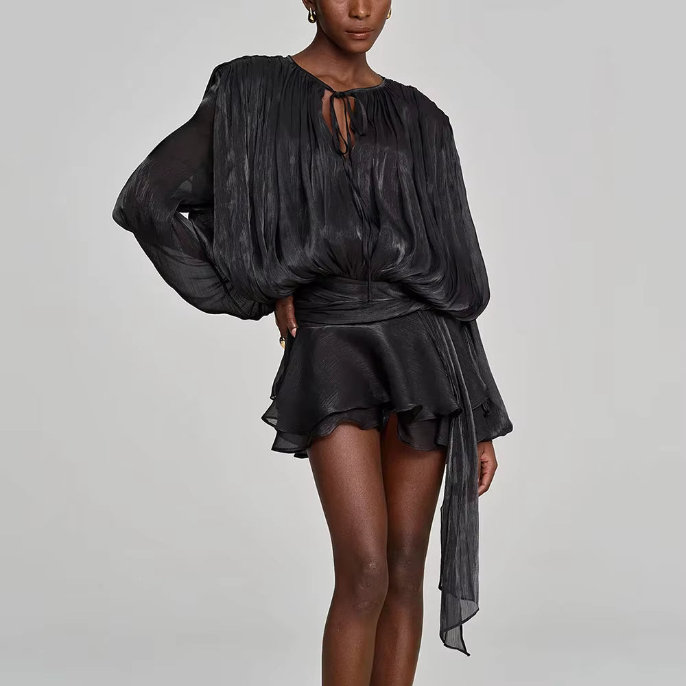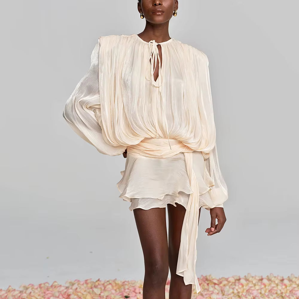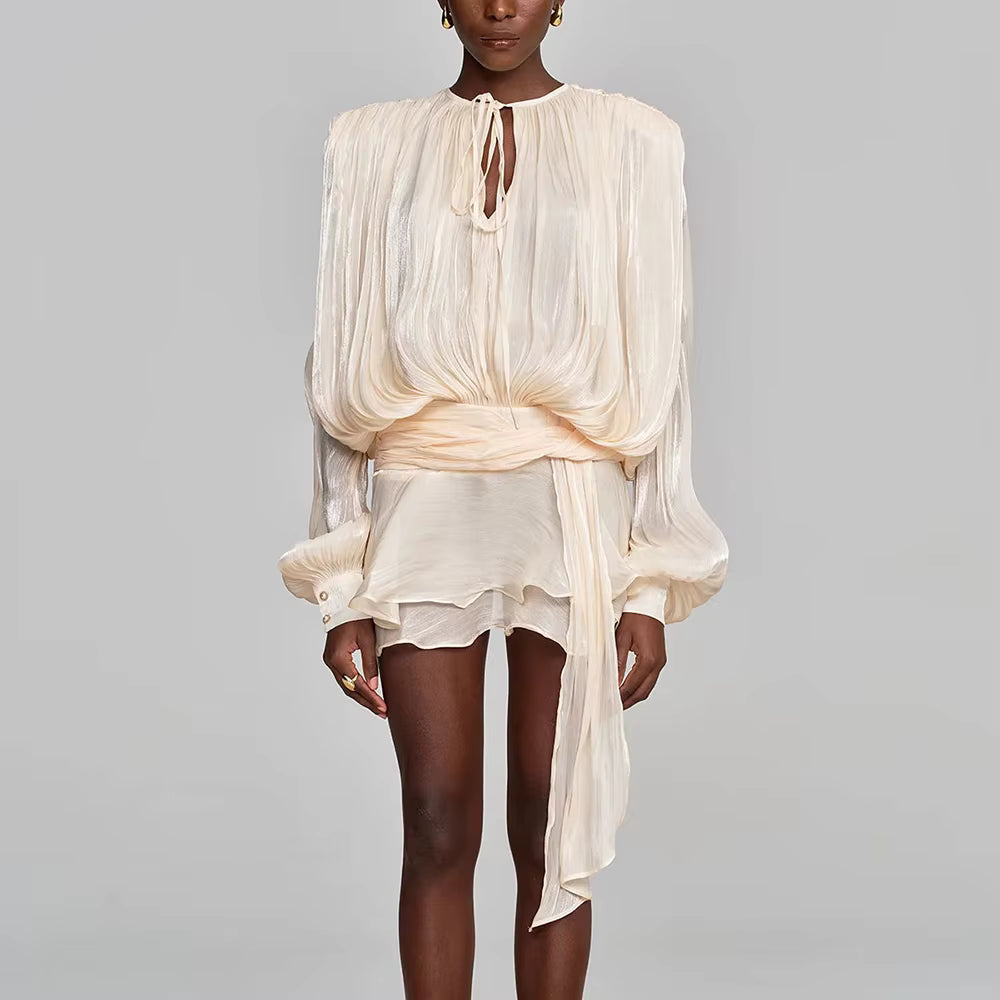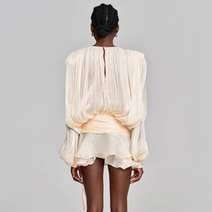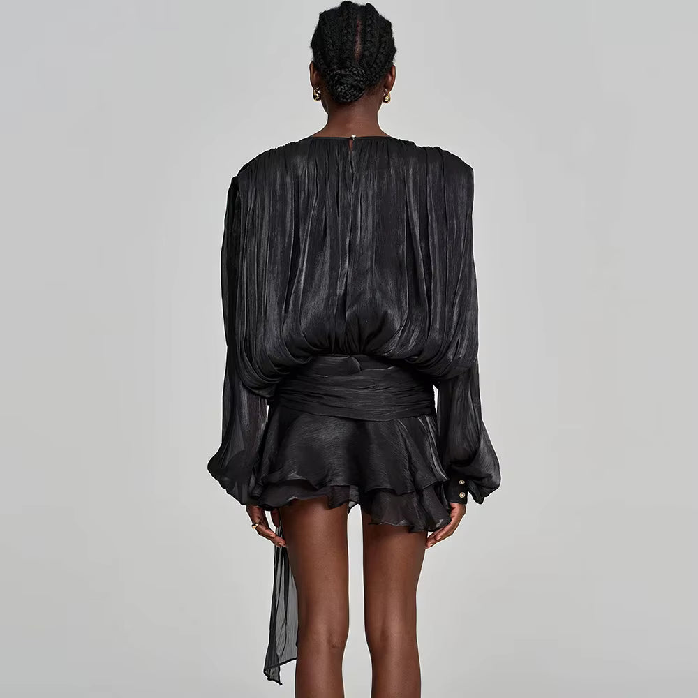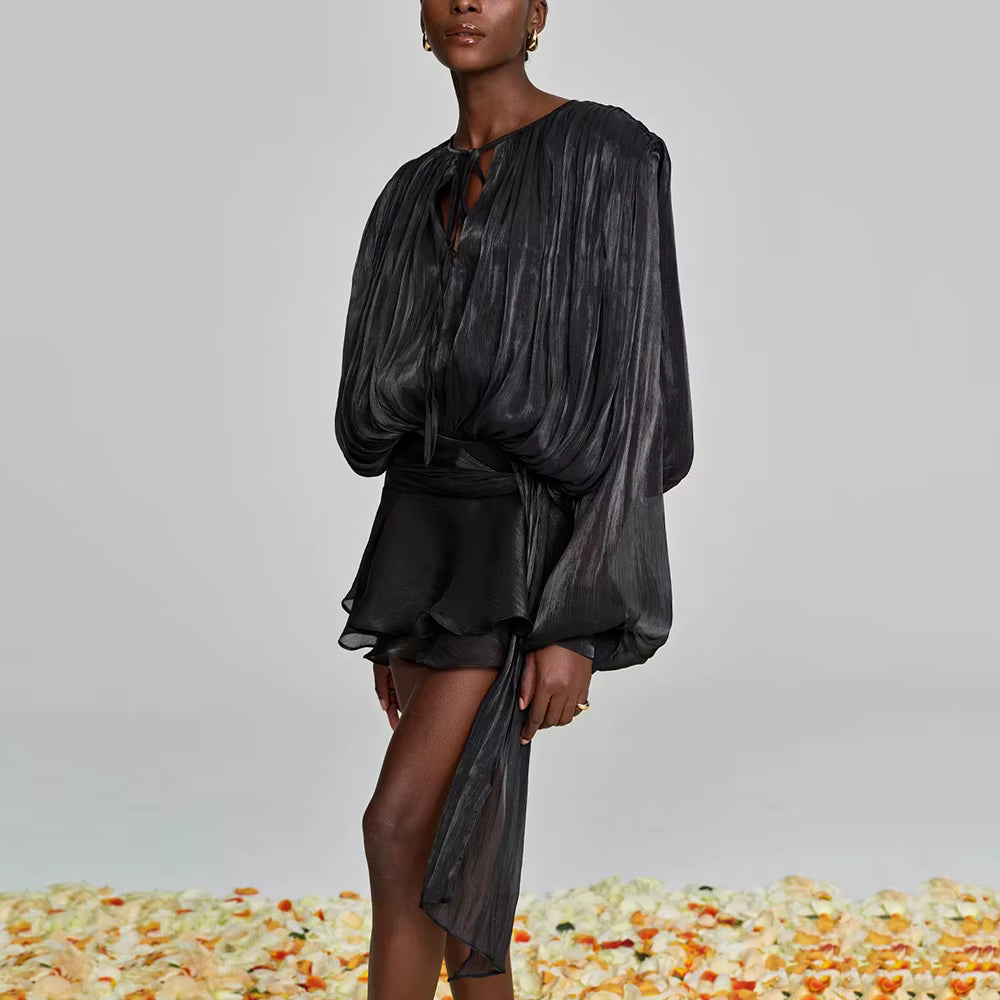 VALÉRIA Ruched Lantern-Sleeve Mini Dress, a sophisticated statement piece that effortlessly elevates your wardrobe. Crafted with meticulous attention to detail, this dress features elegantly ruched fabric that creates a flattering silhouette, while the distinctive lantern sleeves add a contemporary edge. The refined mini length strikes the perfect balance between modern and timeless, making it ideal for upscale occasions or elevated everyday wear. Designed for the discerning woman who appreciates quality craftsmanship and understated luxury, this dress embodies European elegance and refined taste.