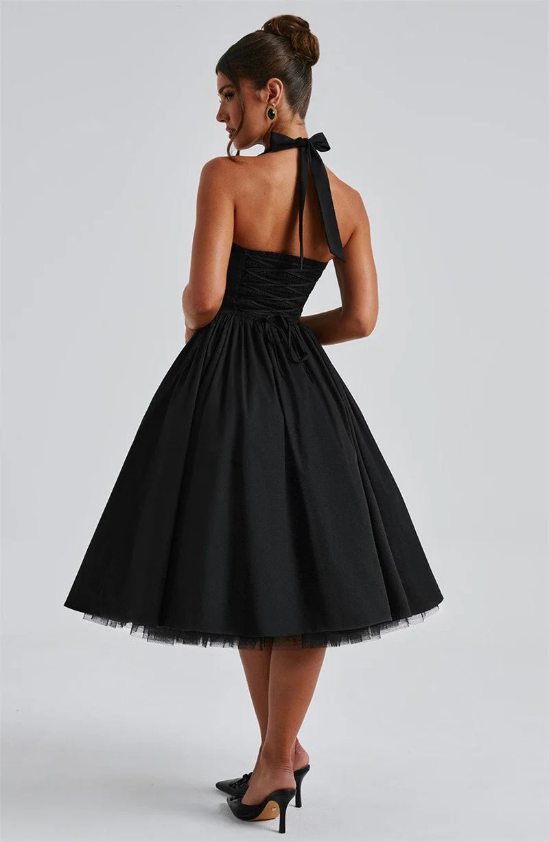 The ALYSÉA Backless Midi Dress embodies refined elegance with its graceful A-line silhouette and minimalist sophistication. Designed with a structured square neckline and a sleek halter design, this piece blends contemporary femininity with timeless appeal. The open-back detail adds a touch of allure, while the pleated midi skirt creates fluid movement. A polished essential for elevated events and stylish evenings.