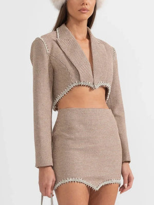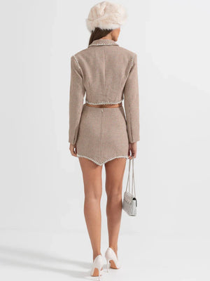 The ARVÉSSA Diamond Patchwork Two-Piece Set blends polished sophistication with subtle luxury. Featuring a tailored notched-collar jacket and a high-waist mini skirt, this set is elevated with refined diamond-style accents for a modern, high-end finish. Designed for women who appreciate clean lines and premium detailing, it delivers a chic, confident look perfect for elevated daywear or evening elegance.