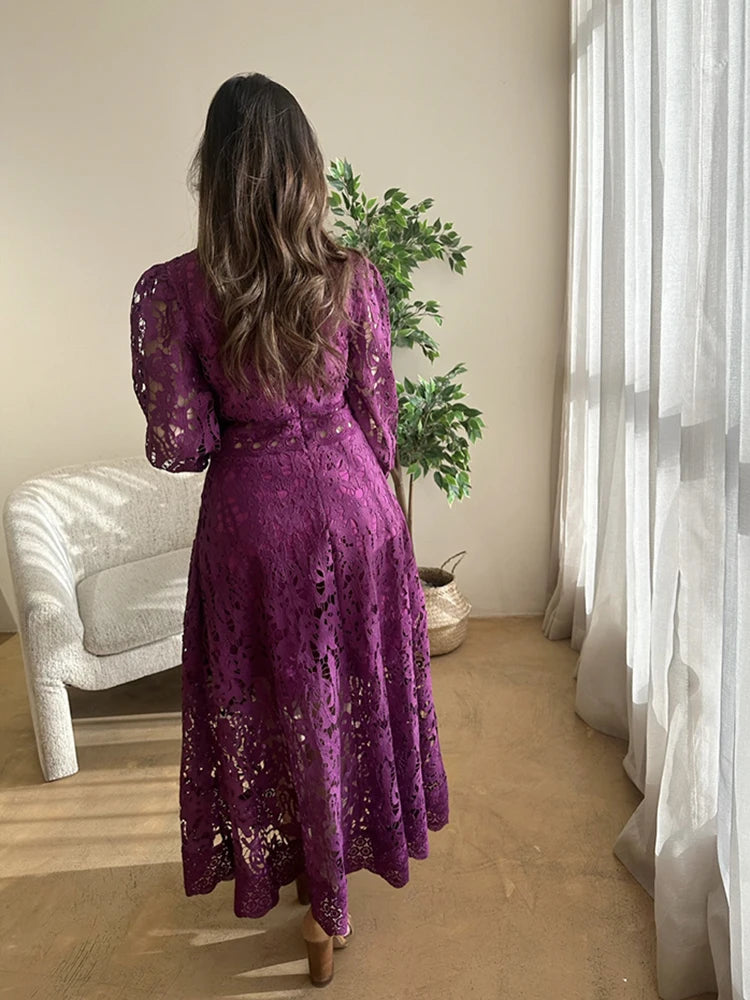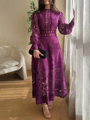 The LAVÉRIA Embroidered Hollow-Out Midi Dress blends refined femininity with timeless elegance. Crafted with delicate embroidery and intricate hollow-out detailing, this piece offers a sophisticated silhouette enriched by graceful lantern sleeves and a flattering high-waist design.